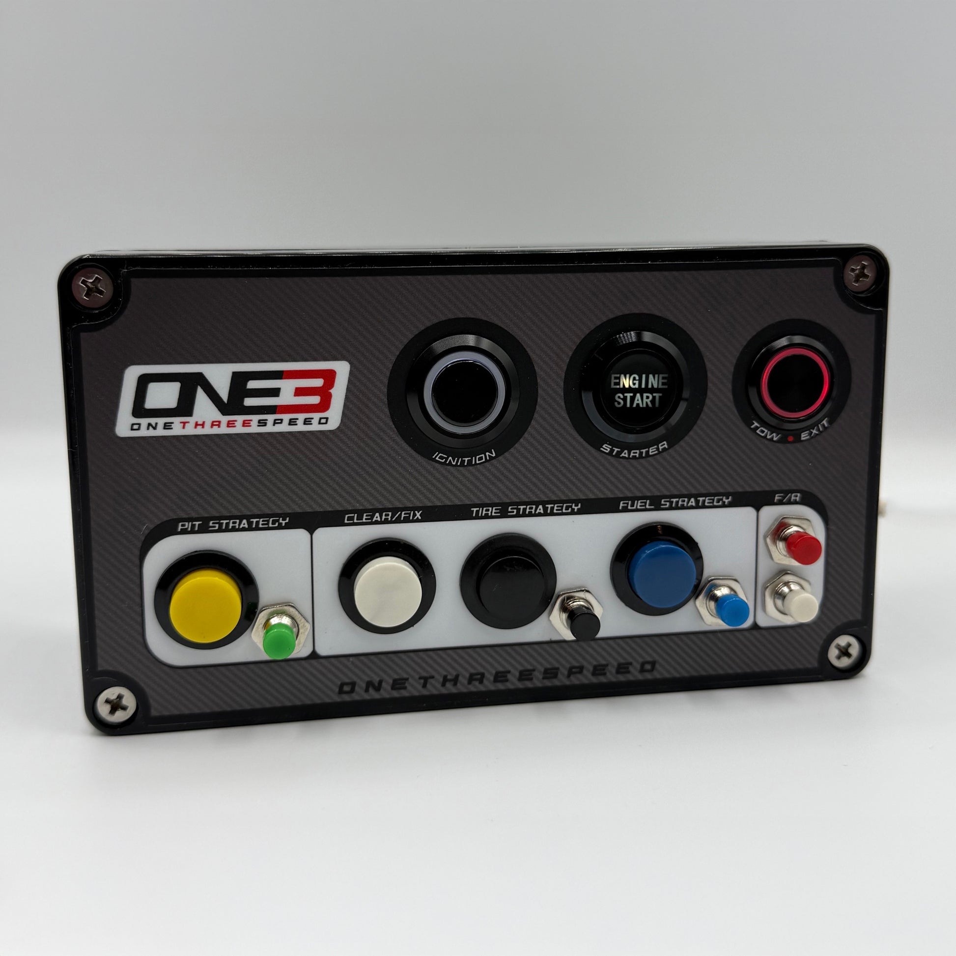 The ONE3 Speed 12-button Mini Button Box provides racers with a realistic experience with external controls plus programmable pit strategy buttons. Stop fumbling with on-screen pit setups with a mouse and a black box!